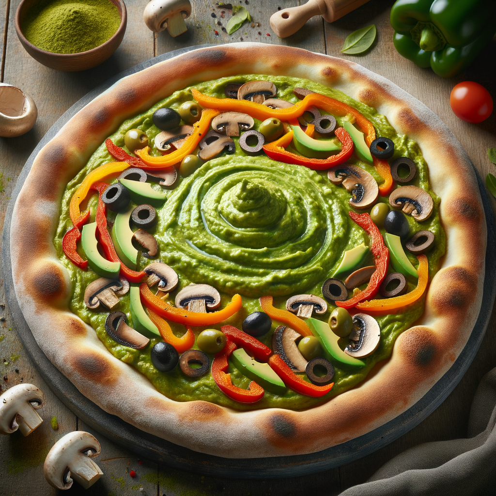 A thin-crust pizza topped with a luscious avocado dressing, roasted bell peppers, mushrooms, and olives. Perfect for a light and refreshing meal.