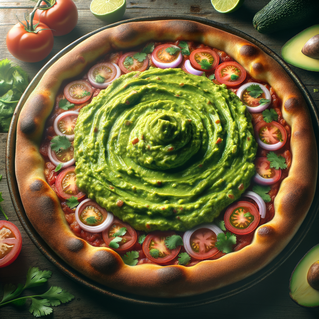 A Chicago-style deep-dish pizza topped with creamy guacamole, fresh tomatoes, onions, and a sprinkle of cilantro. A unique twist for avocado lovers.