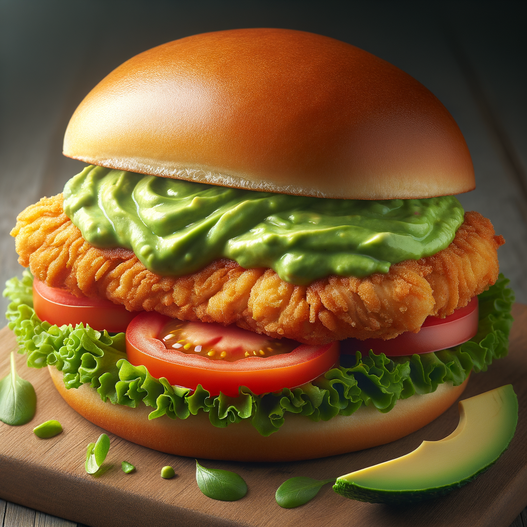 A toasted butter bun sandwiching a hand-breaded chicken breast, topped with lettuce, tomato, and a thick layer of smooth avocado dip, creating a lush and indulgent chicken sandwich experience.