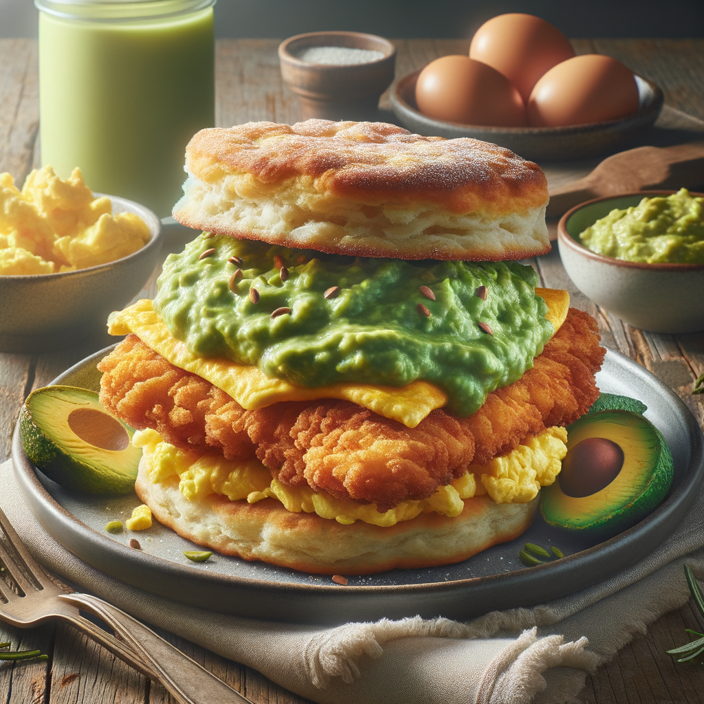 A fluffy buttermilk biscuit sandwiching a tender fried chicken breast, a layer of scrambled eggs, and a spread of creamy guacamole.