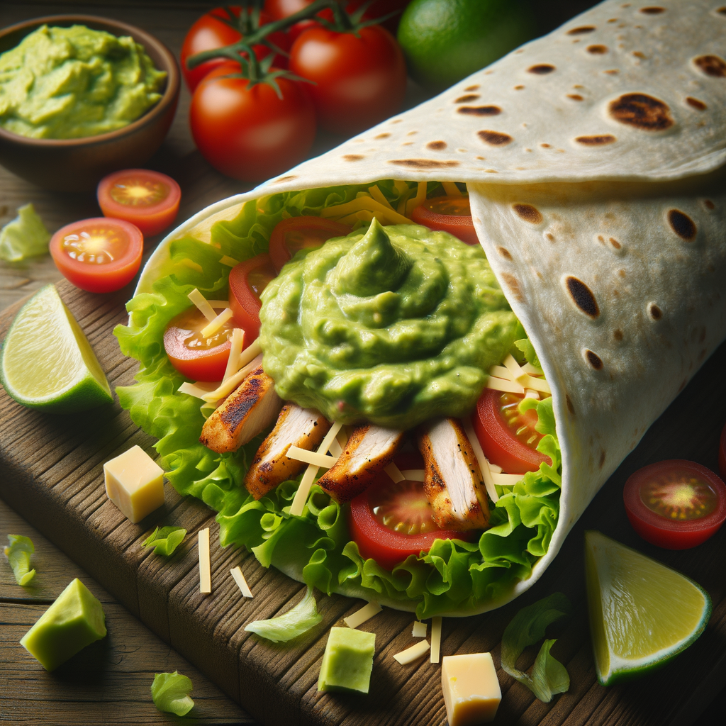 A soft flour tortilla filled with grilled chicken strips, fresh lettuce, diced tomatoes, shredded cheese, and a generous spread of creamy avocado-lime dressing.