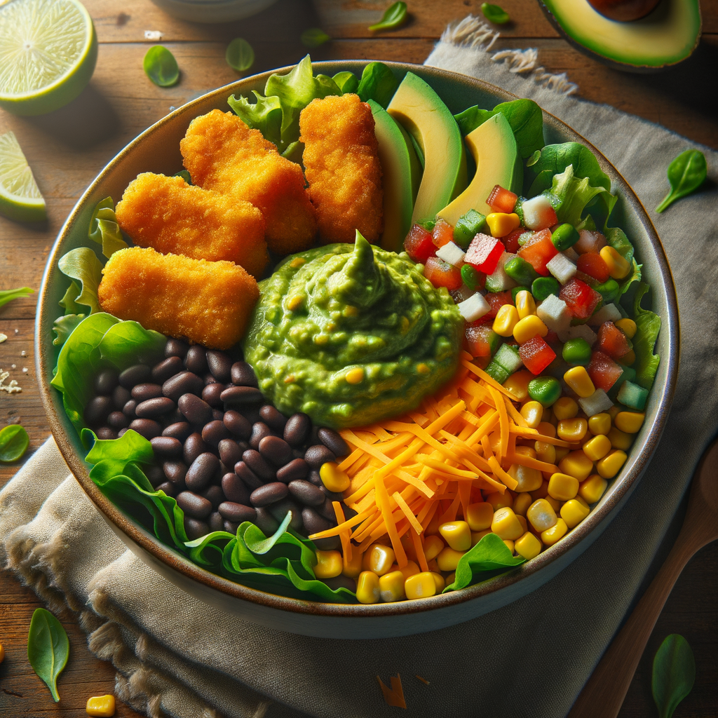 A hearty salad mix topped with crispy chicken nuggets, black beans, corn, a sprinkle of cheddar cheese, pico de gallo, and finished with a dollop of zesty guacamole.