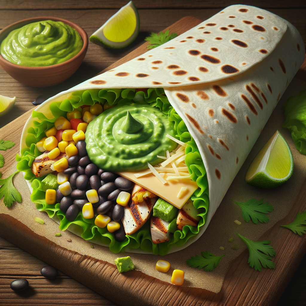 A fresh tortilla wrap filled with grilled chicken, black beans, corn, lettuce, cheese, and a generous spread of zesty avocado dip.