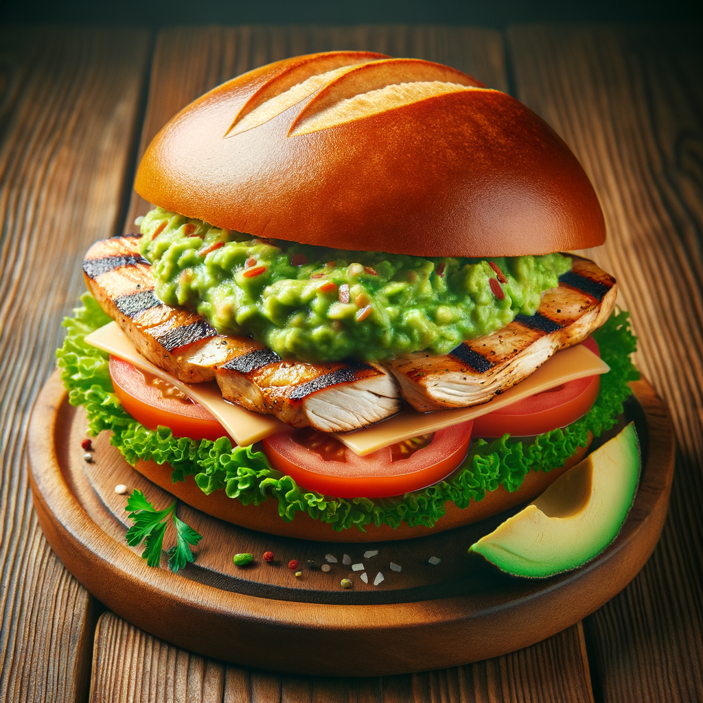 A toasted buttery bun sandwiching a seasoned grilled chicken breast, topped with lettuce, tomato, melted cheese, and a hearty dollop of rich guacamole.