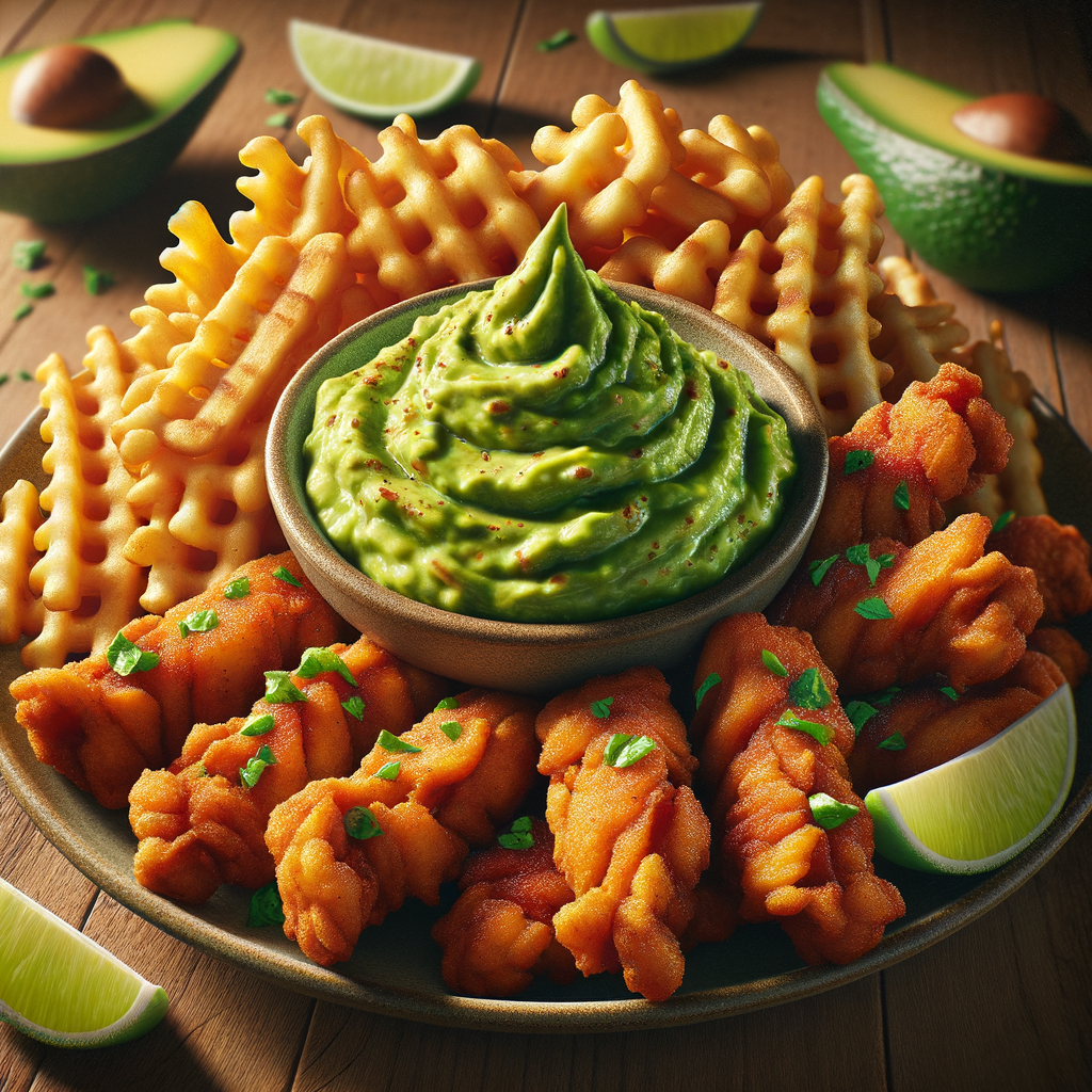 Succulent chicken strips with a hint of southern spice, glazed with a smooth avocado dressing and served with a side of crispy waffle fries.