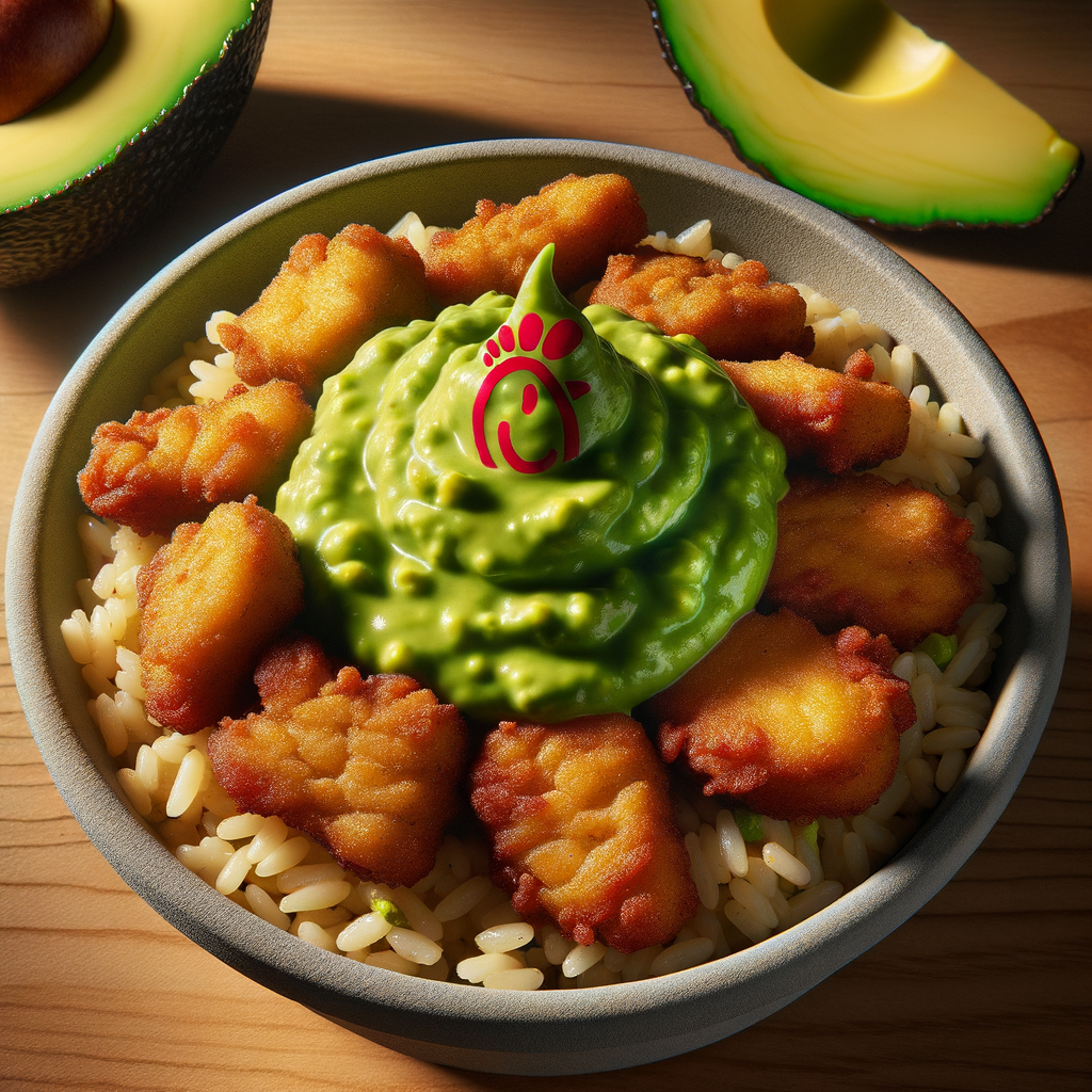 Chick-fil-A's signature chicken nuggets served over a bed of seasoned rice, drizzled with an avocado dressing, and garnished with a dollop of fresh guacamole.