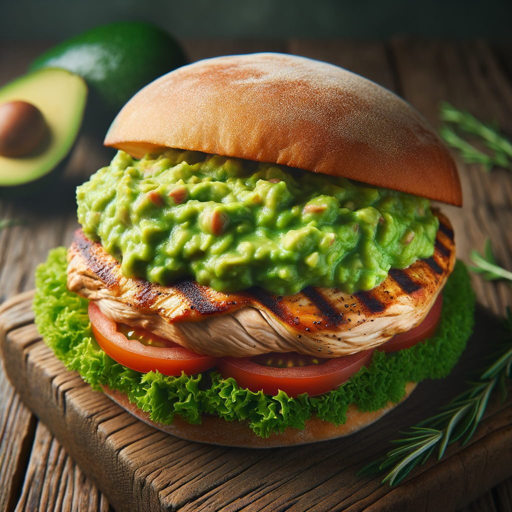 A succulent grilled chicken breast topped with a thick layer of creamy guacamole, served on a toasted multigrain bun with lettuce and tomato.