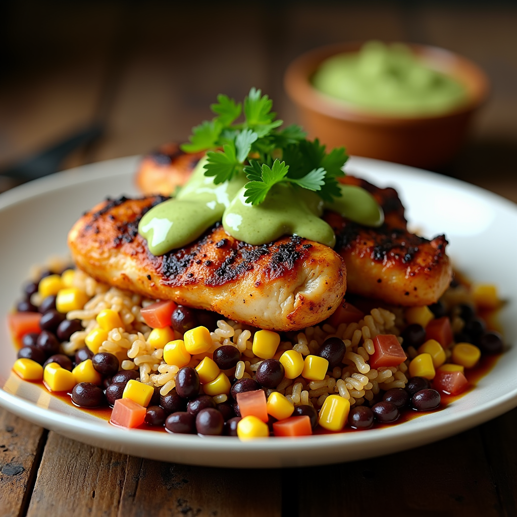 Grilled spicy chicken served over a bed of seasoned rice, black beans, corn, and pico de gallo. Topped with fresh cilantro and a generous drizzle of spicy guacamole dressing.