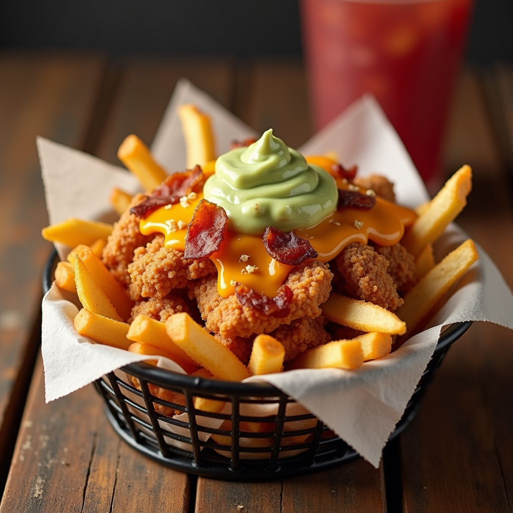 A basket of Chick-fil-A's signature waffle fries, loaded with grilled chicken pieces, melted cheddar cheese, bacon bits, and a dollop of cool, refreshing Mash Guac.
