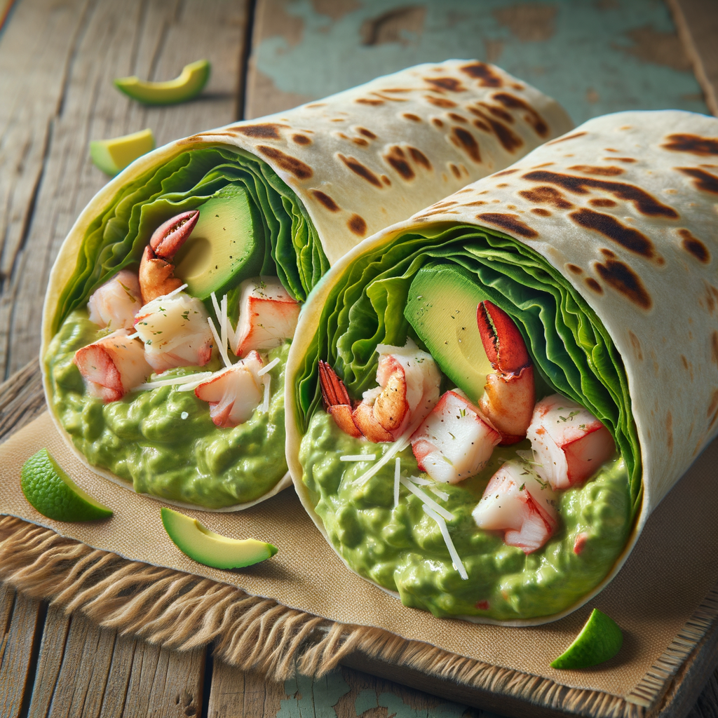 A refreshing Caesar wrap filled with succulent lobster pieces, crisp romaine lettuce, Parmesan shavings, and a generous spread of creamy avocado dressing, all wrapped in a soft flour tortilla.