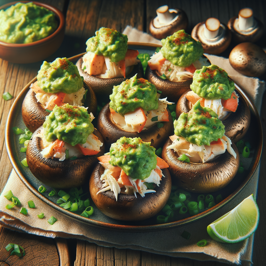 Succulent mushrooms stuffed with a rich blend of Crabfries® seasoning, lump crab meat, and a hint of Philadelphia cream cheese, topped with a dollop of vibrant, creamy guacamole.
