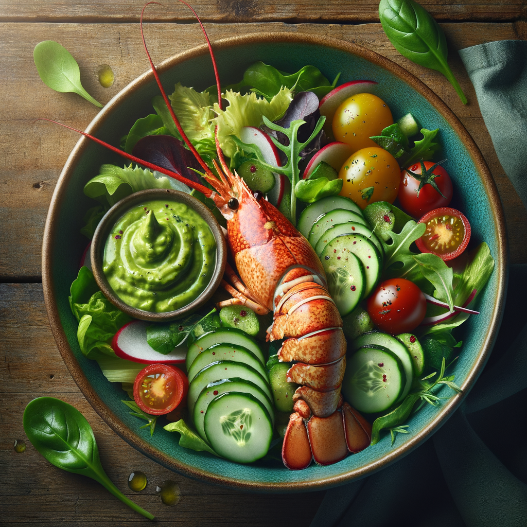 A refreshing salad featuring tender lobster pieces on a bed of mixed greens, cherry tomatoes, and cucumbers, all tossed in a light avocado dressing with a hint of citrus.