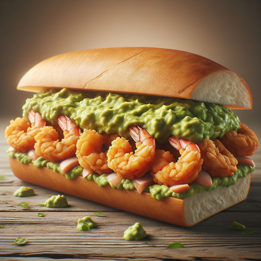 A classic po' boy sandwich packed with crispy fried shrimp, drizzled with a spicy remoulade, and complemented by a generous spread of smooth guacamole on a fresh hoagie roll.