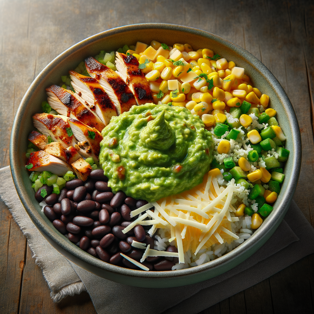 A bowl filled with cilantro-lime rice, black beans, corn salsa, grilled chicken drizzled with chipotle sauce, and topped with a hearty scoop of guacamole and shredded cheese.