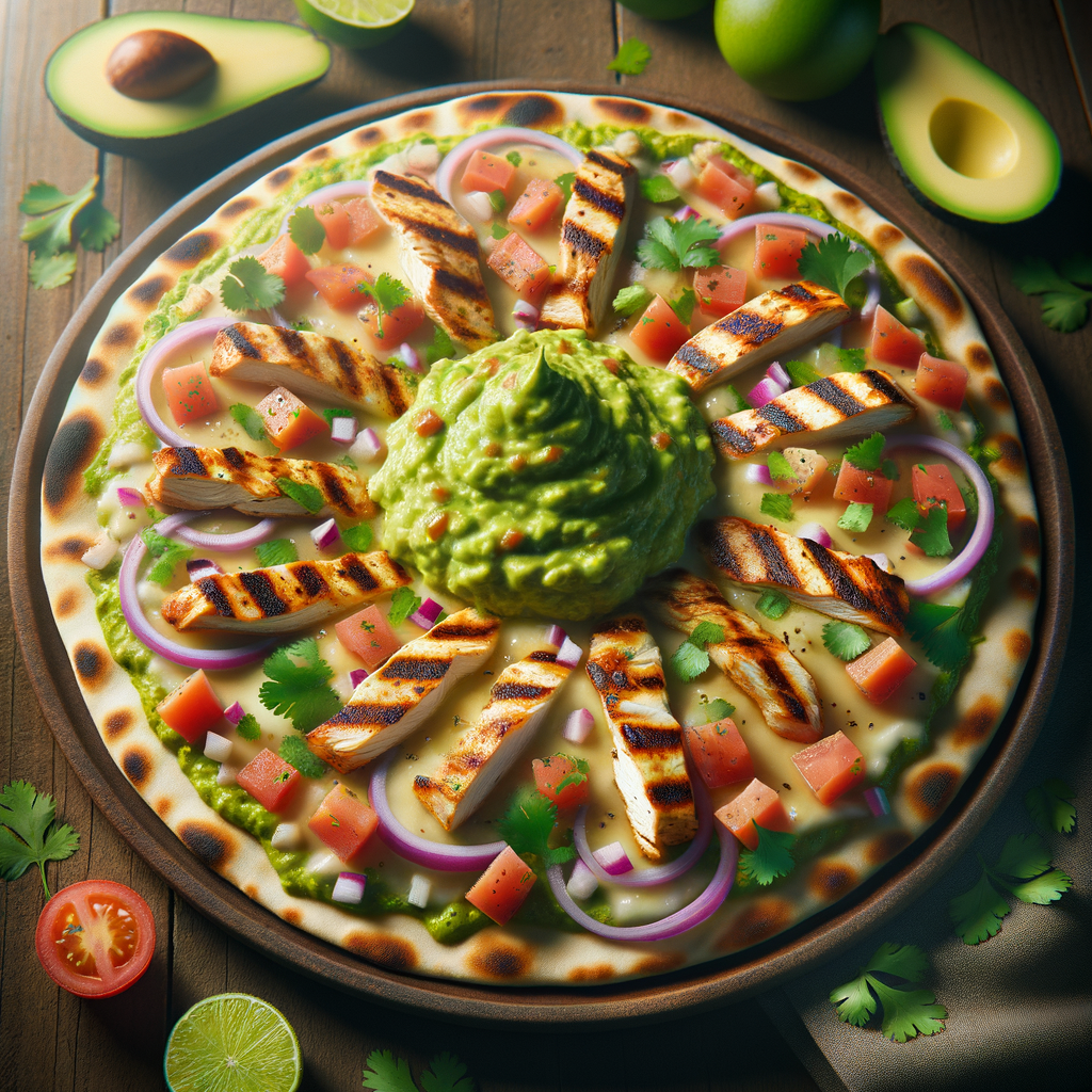 Grilled chicken strips layered on a crispy flatbread with a blend of melted cheeses, diced tomatoes, red onions, cilantro, and a drizzle of avocado ranch dressing, finished with a scoop of fresh guacamole.