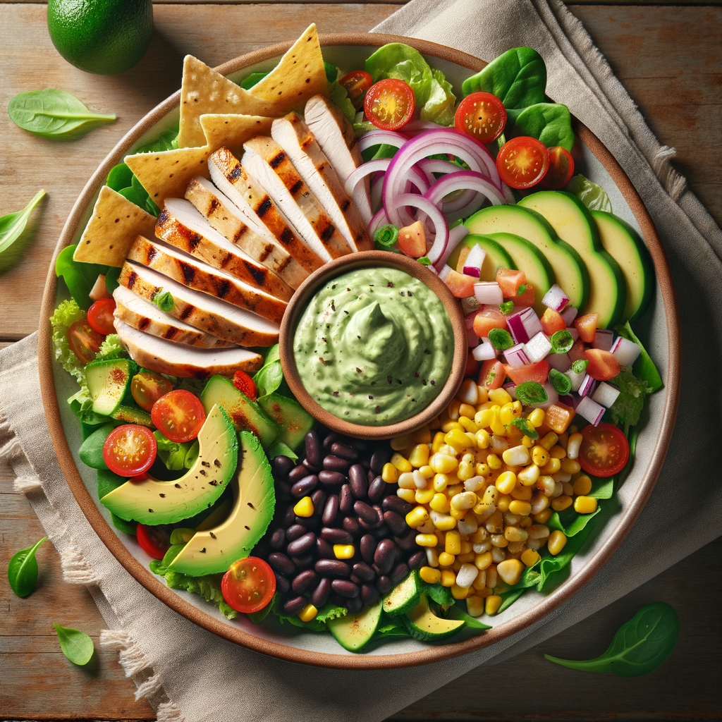 Grilled chicken breast slices laid on a bed of mixed greens, accompanied by black beans, sweet corn, cherry tomatoes, and red onions, all drizzled with a creamy avocado ranch dressing and topped with crunchy tortilla strips.