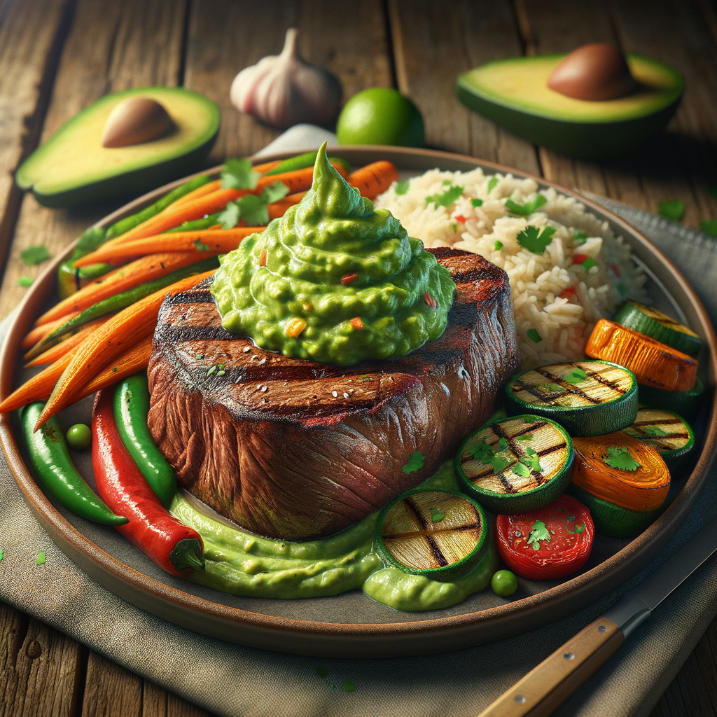 A perfectly seasoned and grilled sirloin steak topped with a scoop of classic guacamole, served with a side of roasted vegetables and cilantro-lime rice.