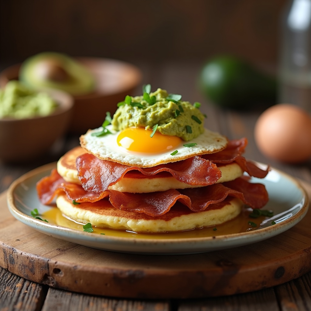 Fluffy buttermilk pancakes layered with crispy bacon, a fried egg, and a dollop of creamy guacamole. Sweet, savory and decadent breakfast starter.