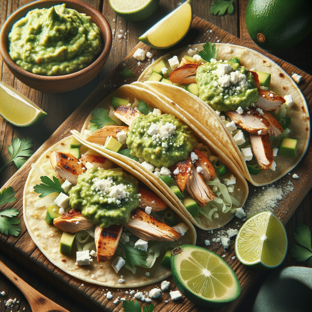 Soft corn tortillas filled with juicy grilled chicken, a dollop of avocado-lime dressing, and a sprinkle of cotija cheese. Each taco is finished with a smear of guacamole spread over the top, offering a creamy and tangy flavor that complements the spices.