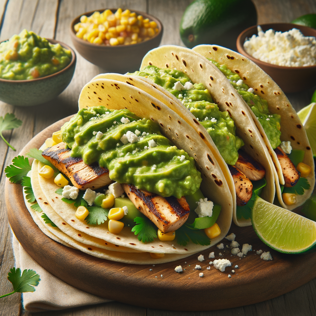 Soft corn tortillas embrace grilled chicken or steak, adorned with a layer of smooth avocado lime dressing, topped with corn salsa, a sprinkle of cotija cheese, and a handful of fresh cilantro leaves, offering a creamy and tangy taste with every bite.