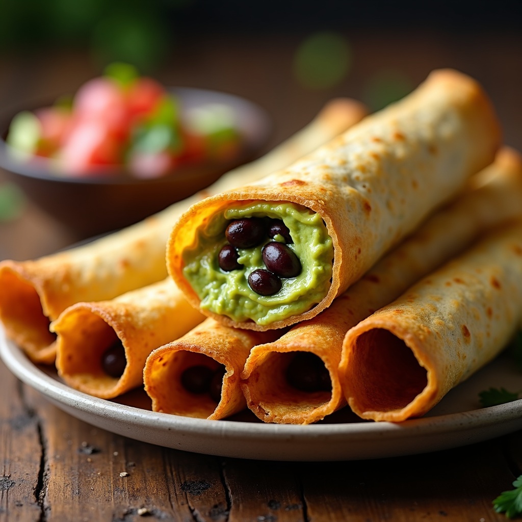 Crispy rolled corn tortillas packed with spiced black beans and a swirl of Avocado Dip. Served with a tangy pico de gallo and a drizzle of cilantro-lime crema for freshness.