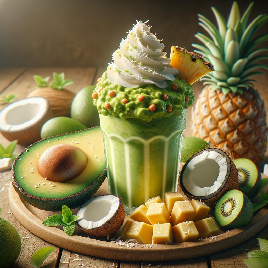 A creamy milkshake that combines the smoothness of avocado guacamole with the sweetness of coconut ice cream and a splash of pineapple juice, topped with a dollop of whipped cream and shredded coconut, creating a dreamy island-inspired treat.