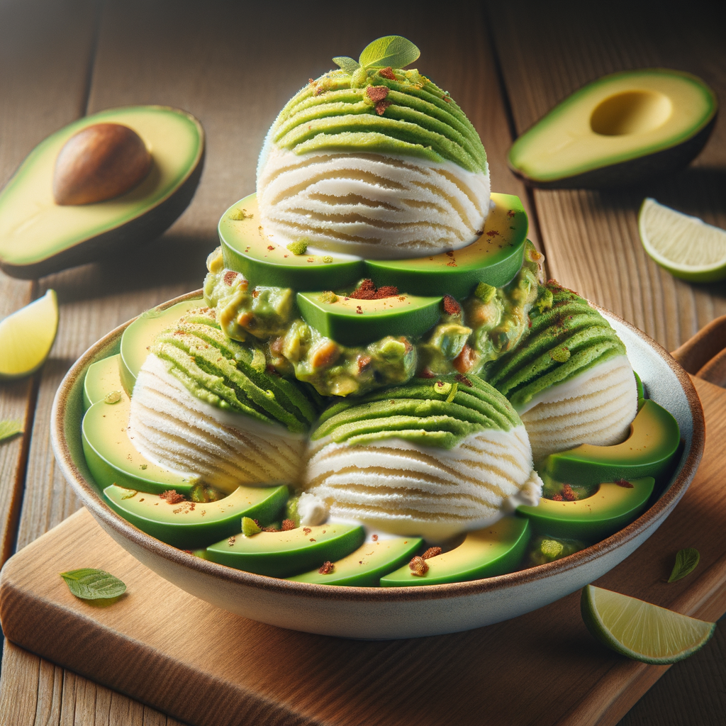 A refreshing and indulgent ice cream creation featuring a rich vanilla base swirled with creamy avocado lime guacamole and garnished with a sprinkle of zesty lime zest, offering a unique and smooth tropical taste experience.