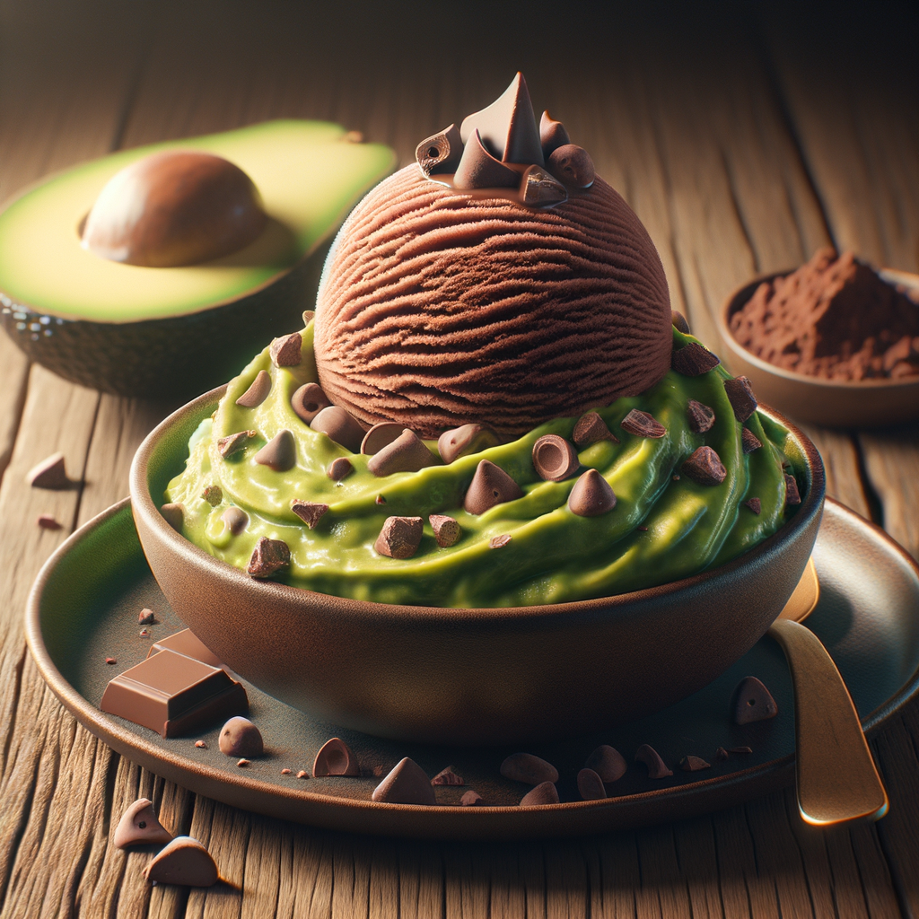 A decadent chocolate ice cream treat blended with a silky avocado chocolate guacamole, topped with crunchy cacao nibs for a rich, velvety texture, creating a daring yet delicious flavor combination that's both smooth and crunchy.