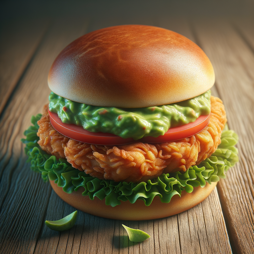 A tender, crispy chicken fillet crowned with a smooth layer of guacamole, crisp lettuce, and ripe tomato slices, served on a soft bun for a satisfying crunch with every bite, merging classic comfort with a hint of avocado goodness.