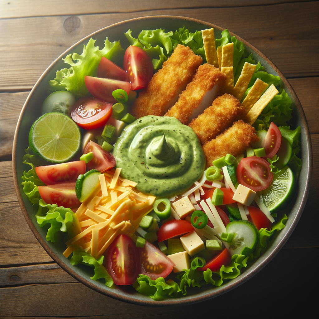 Lightly breaded fish filets served over a bed of crisp lettuce and diced tomatoes, drizzled with a zesty avocado-lime dressing, and garnished with shredded cheese and crunchy tortilla strips.