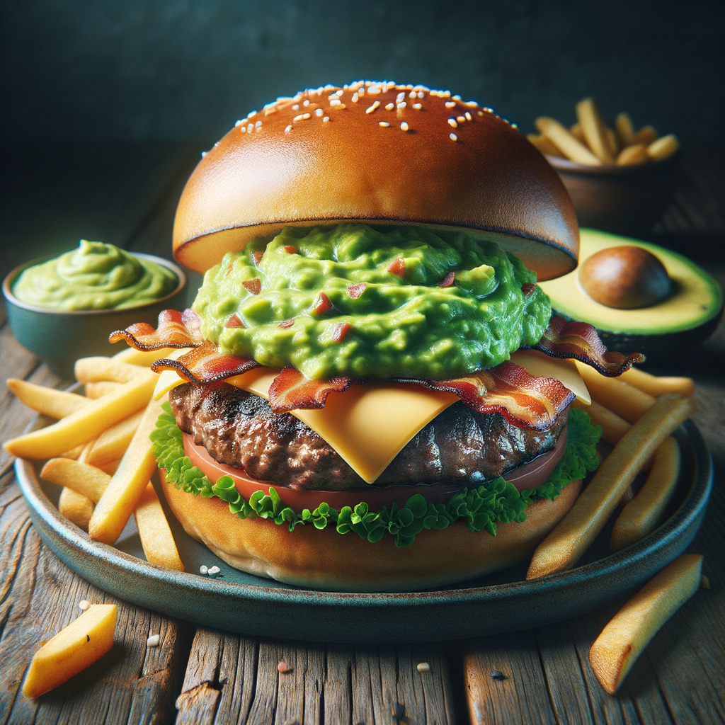A juicy grilled beef patty topped with melted pepper jack cheese, crispy bacon, and a generous dollop of zesty guacamole, served on a toasted brioche bun with a side of seasoned fries.