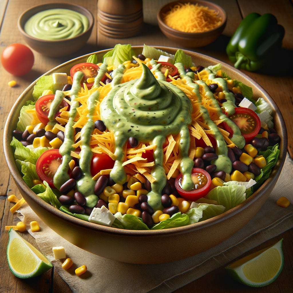 Crisp romaine lettuce tossed with black beans, sweet corn, cherry tomatoes, shredded cheese, and crunchy tortilla strips, all drizzled with a creamy avocado ranch dressing.