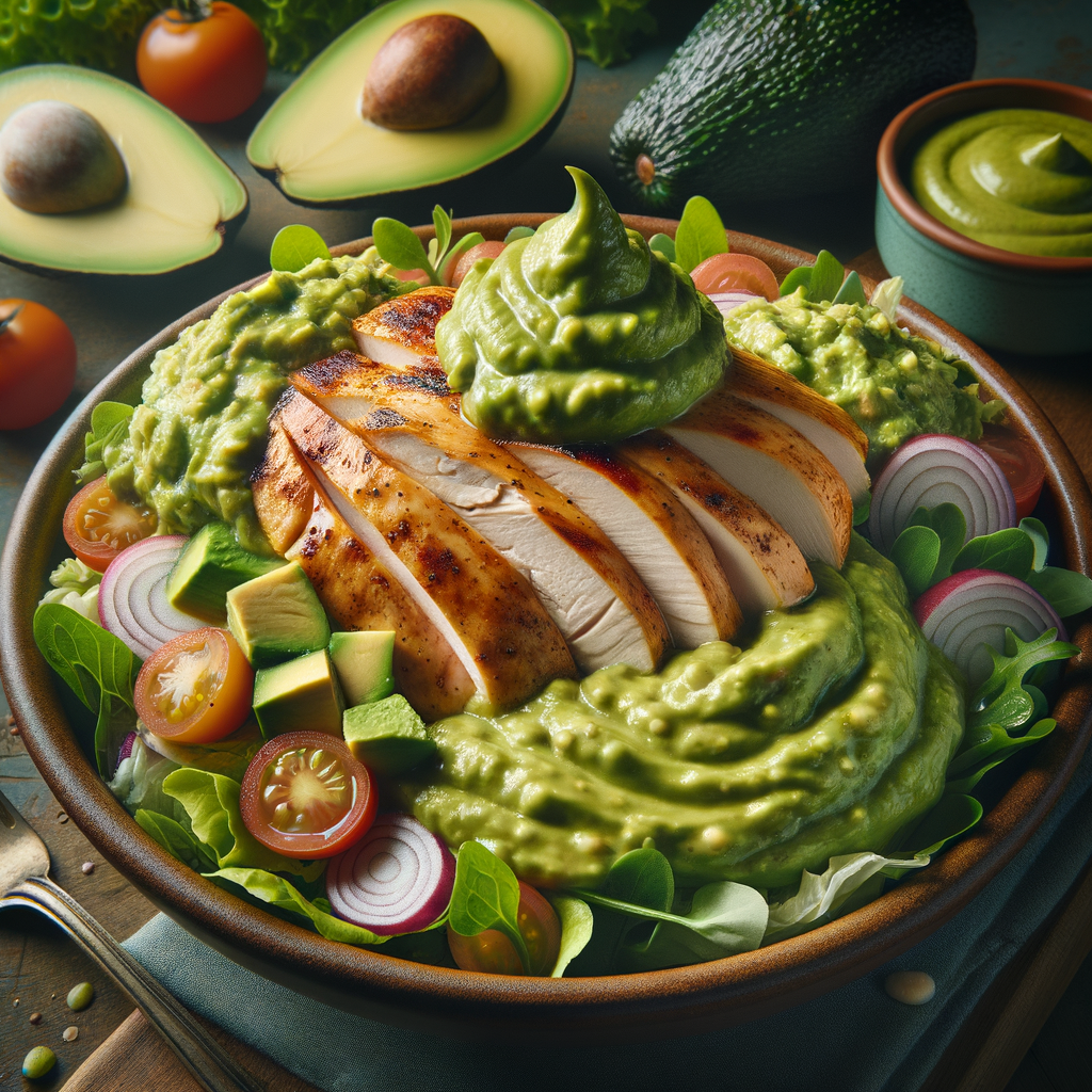 Grilled chicken breast seasoned with smoky spices, served over a bed of mixed greens and topped with a rich avocado dressing, garnished with roasted corn, black beans, and cherry tomatoes.