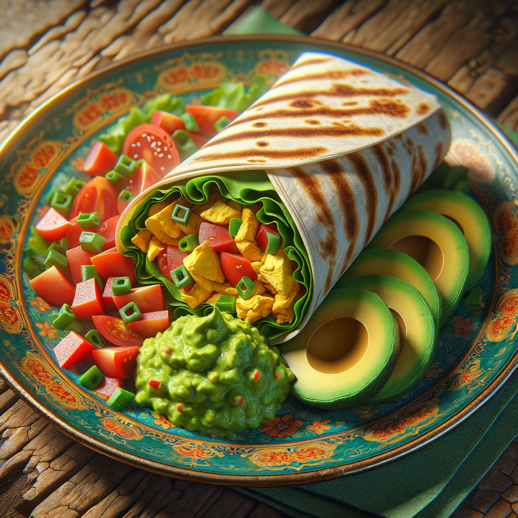 A warm wrap featuring scrambled eggs, guacamole, and diced tomatoes. A convenient and tasty on-the-go breakfast.