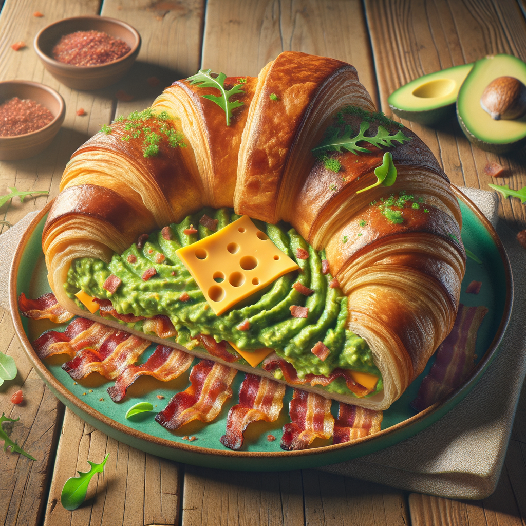 A buttery croissant filled with guacamole, crispy bacon, and a slice of cheddar cheese. A deliciously savory breakfast option.