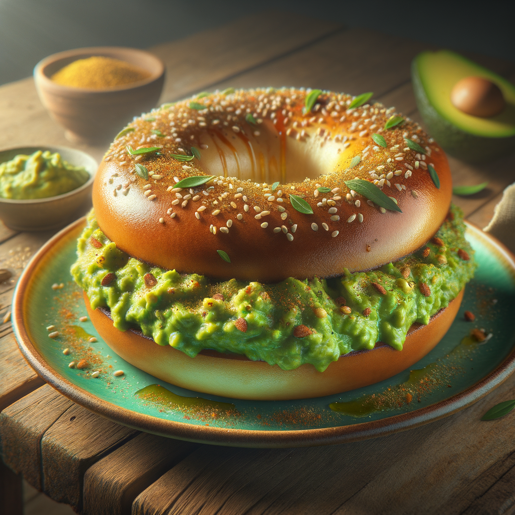 A toasted bagel topped with creamy guacamole, a sprinkle of everything bagel seasoning, and a drizzle of olive oil. Perfect for a fresh start to your day.