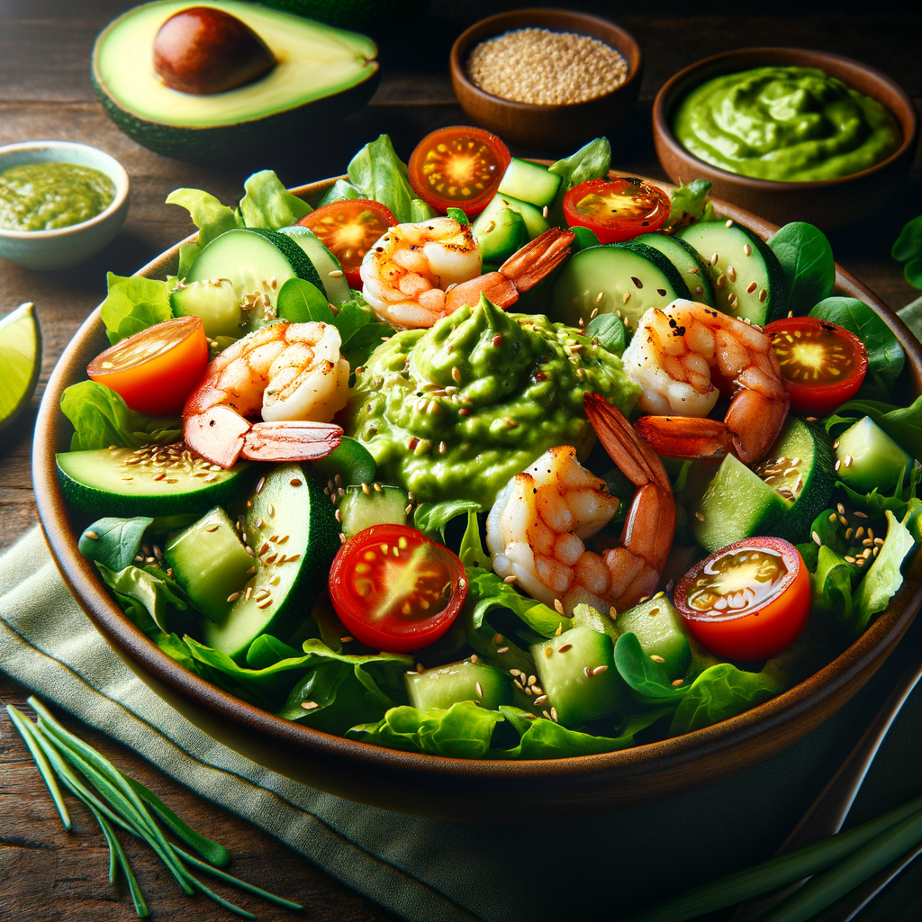 A bed of mixed greens tossed with succulent grilled shrimp, cherry tomatoes, and cucumber slices, all drizzled with an avocado lime dressing and sprinkled with toasted sesame seeds.