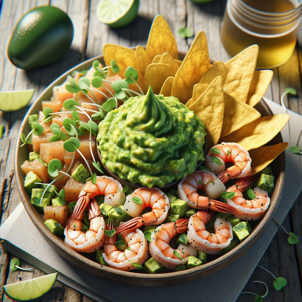 A refreshing blend of finely diced fresh seafood marinated in lime juice, complemented by a generous dollop of smooth guacamole on top, garnished with microgreens and served with a side of crispy plantain chips.