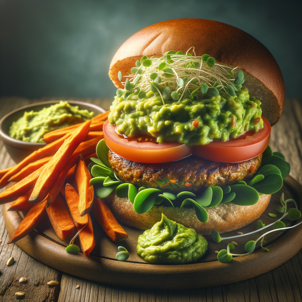 A hearty vegetarian burger patty on a whole grain bun, topped with a thick layer of savory guacamole, alfalfa sprouts, and a slice of ripe tomato, accompanied by sweet potato fries.