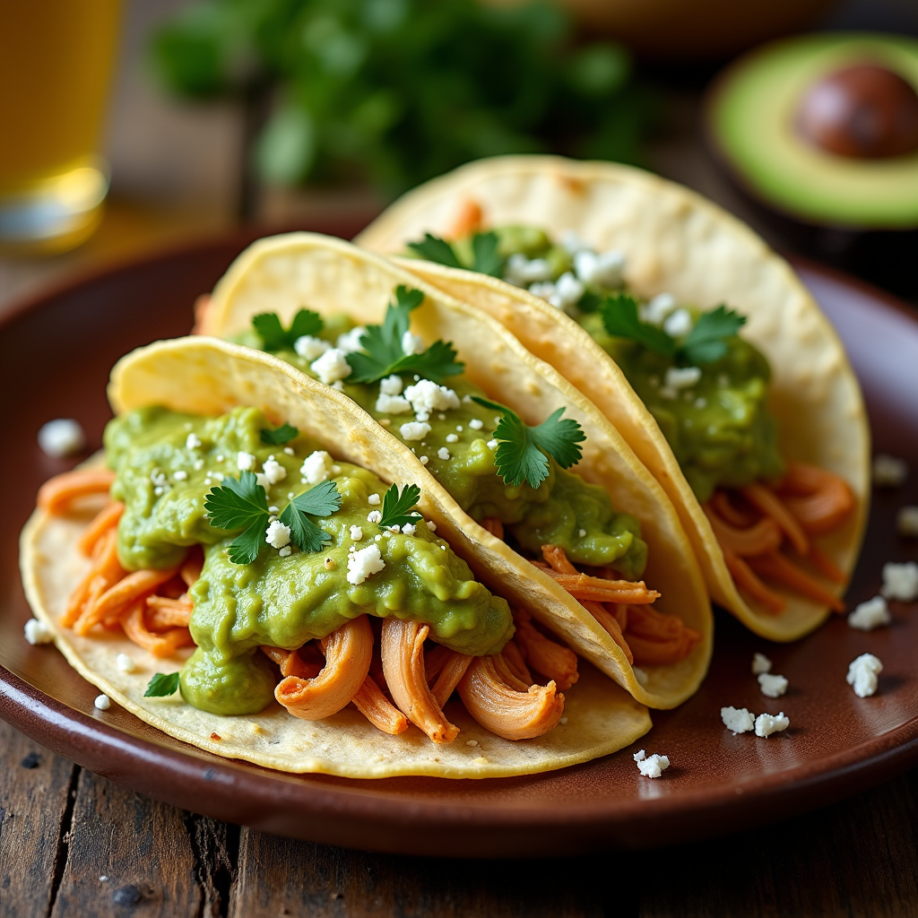 Corn tortillas are filled with creamy guacamole and shredded chicken, smothered in a tangy tomatillo sauce, and topped with queso fresco. A delightful twist on a classic.