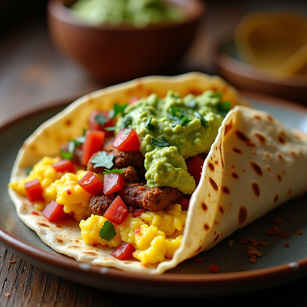 Scrambled eggs, chorizo, and pico de gallo are enveloped in a warm tortilla with a generous spread of house-made guacamole. A satisfying, savory start to the day.
