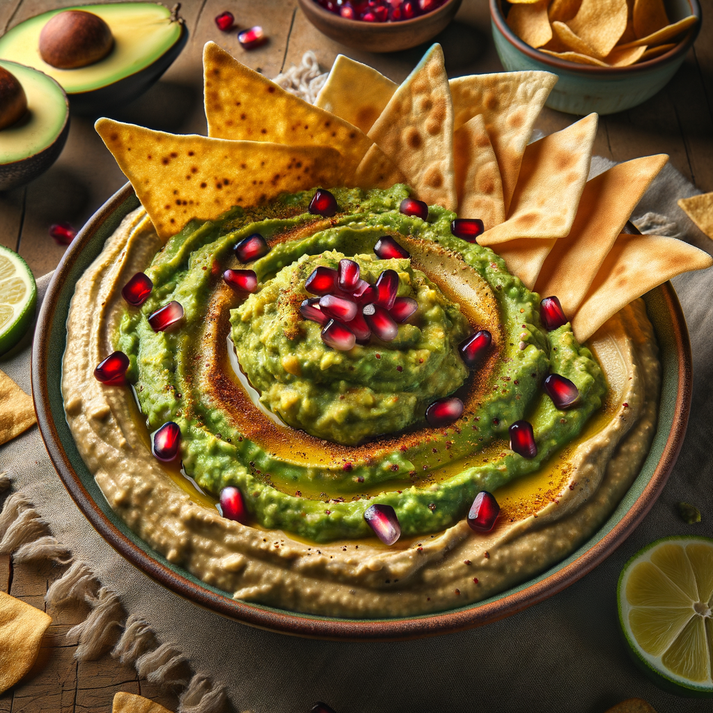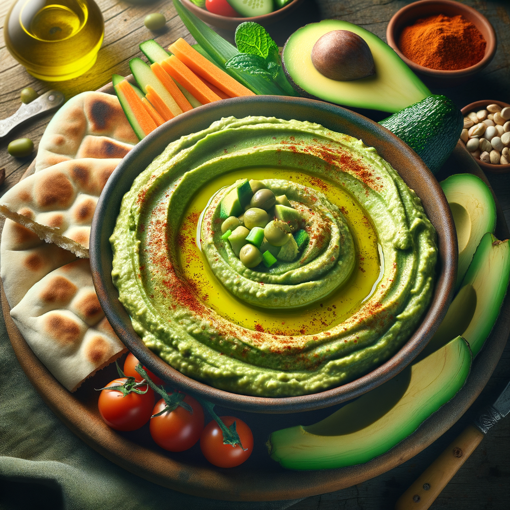 A smooth blend of traditional hummus combined with creamy avocado mash, garnished with olive oil and paprika, served with a side of warm pita bread and an assortment of fresh vegetables for dipping.