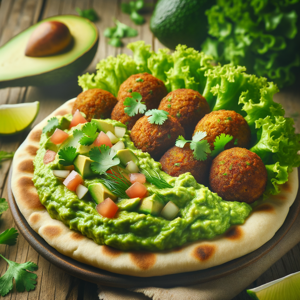 A warm pita bread filled with classic crispy falafels, topped with a zesty guacamole dressing made with ripe avocados, fresh lime juice, cilantro, and a hint of garlic, accompanied by crunchy lettuce and diced tomatoes.