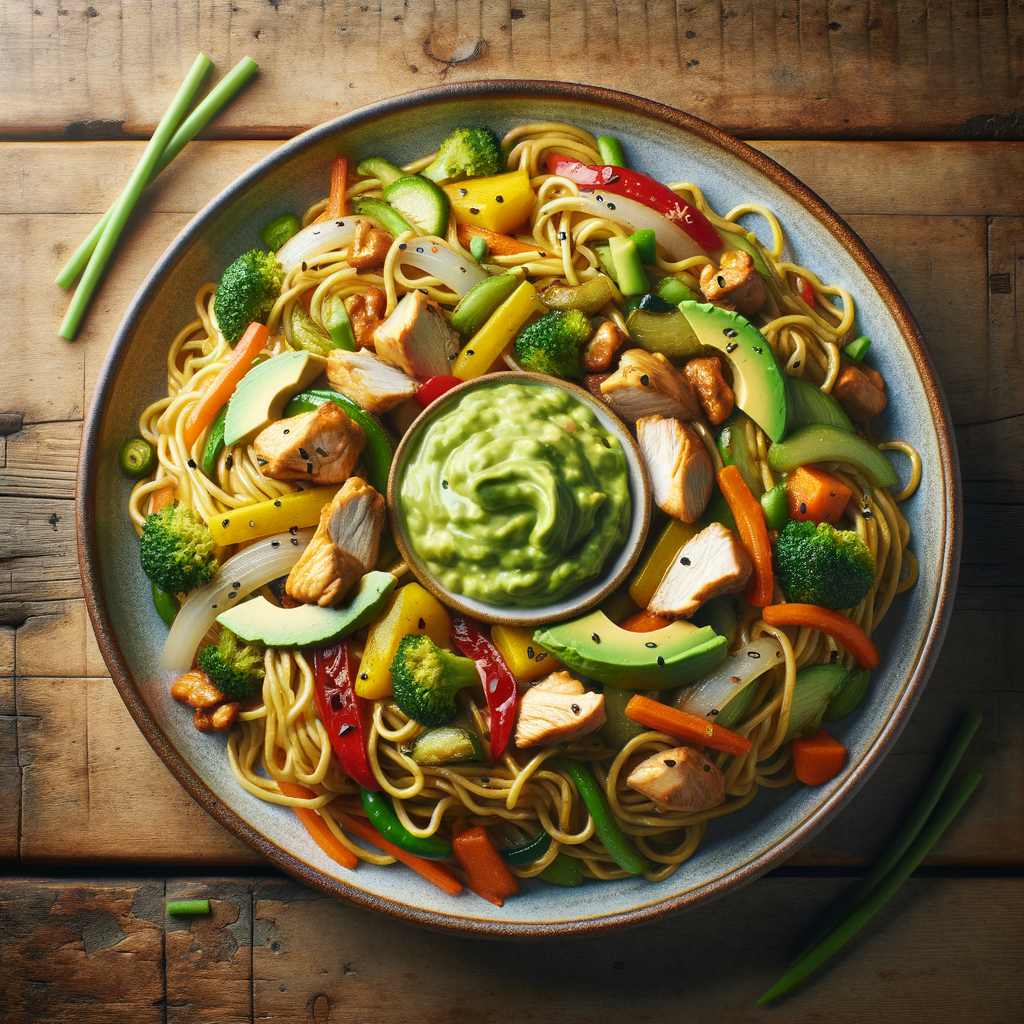 Stir-fried chow mein noodles with tender chicken, mixed vegetables, and topped with a creamy avocado dressing for a unique twist.