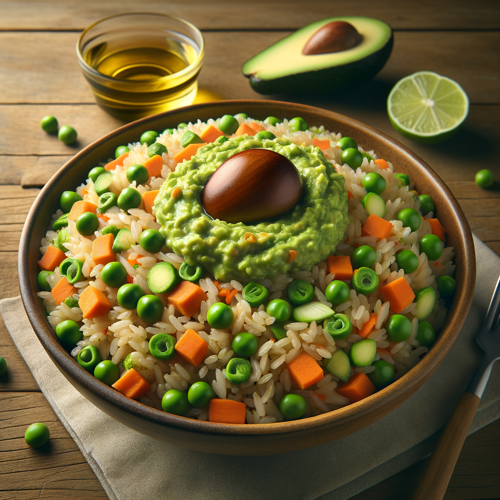 Fried rice infused with a spicy avocado dip, mixed with peas, carrots, and green onions for a flavorful kick.