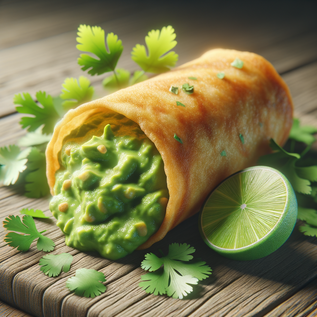 A crispy egg roll filled with creamy guacamole, fresh cilantro, and a hint of lime, served with a sweet chili dipping sauce.