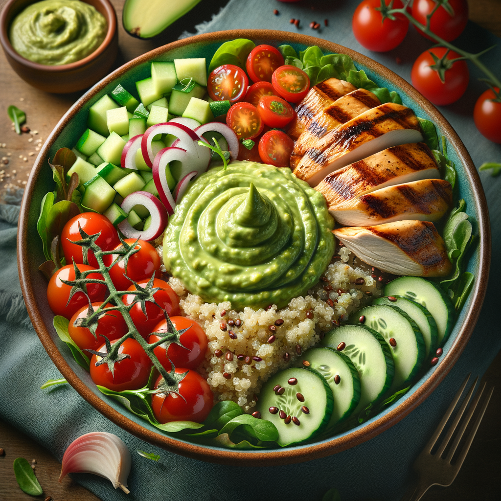 A nourishing bowl featuring a base of quinoa and mixed greens, topped with creamy avocado dressing, cherry tomatoes, cucumbers, and grilled chicken.