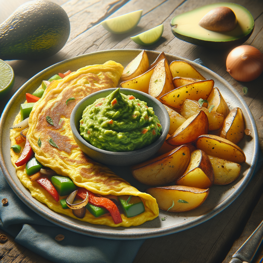 A fluffy omelet filled with sautéed bell peppers, onions, and a generous layer of guacamole, served with a side of roasted potatoes.