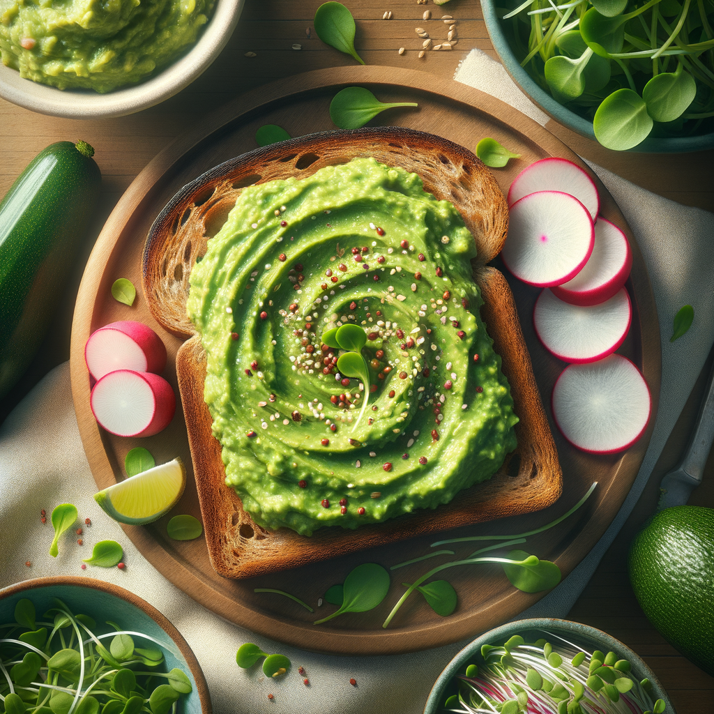 A hearty slice of whole-grain toast topped with creamy guacamole, sliced radishes, and a sprinkle of microgreens, served with a side of mixed greens.