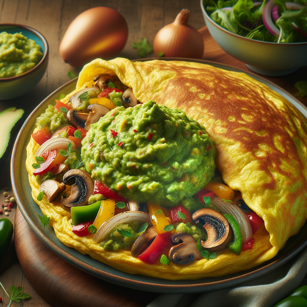 A fluffy omelet filled with creamy guacamole, sautéed bell peppers, onions, and mushrooms, served with a side of mixed greens.